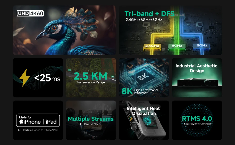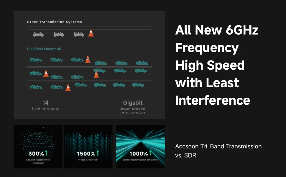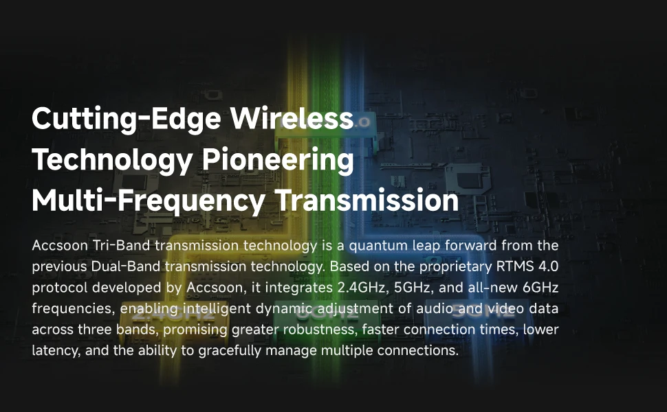 Accsoon Tri-Band transmission technology is a quantum leap forward from the previous Dual-Band transmission technology.Based on the proprietary RTMS 4.0 protocol developed by Accsoon,it integrates 2.4GHz,5GHz,and all-new 6GHz frequencies,enabling intelligent dynamic adjustment of audio and video data across three bands,promising greater robustness,faster connection times,lower latency,and the ability to gracefully manage multiple connections.