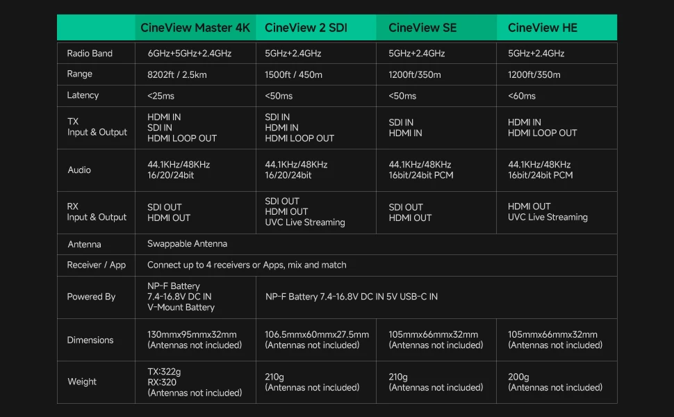 The CineView Master 4K – the world's first Tri-Band 4K60 wireless video transmission system for enhanced stability, with 25ms best in class low latency. It redefines wireless video with a fully end-to-end true 4K60 video quality and an extended 2.5km transmission range.
