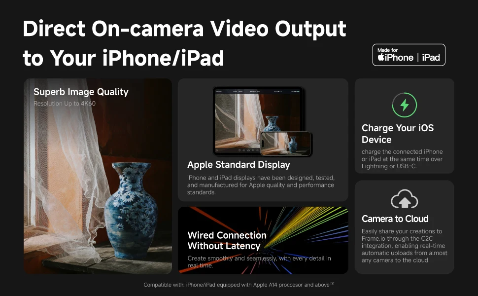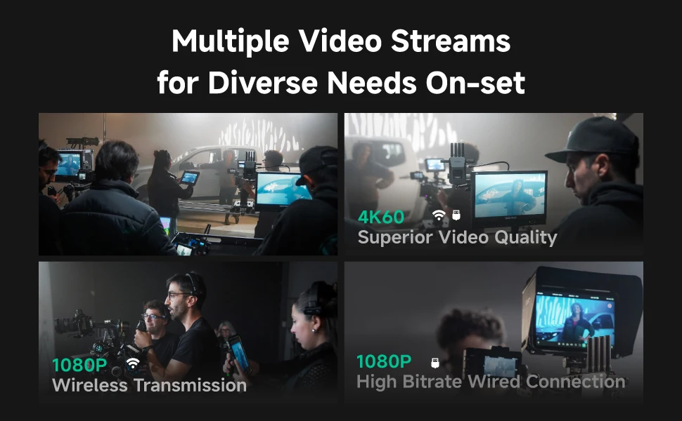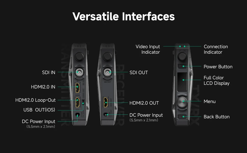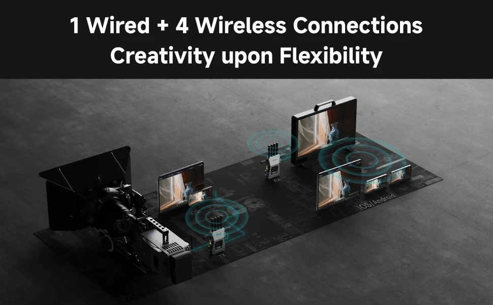 The newly added MFi-certified wired connection on the transmitter transforms a connected iPad or iPhone into a fully-fledged professional camera-top monitor, significantly enhancing on-site monitoring versatility. One set of wireless transmission that meets diverse needs.