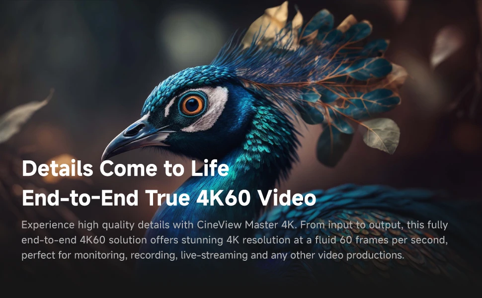 Experience high quality details with CineView Master 4K.From input to output,this fully end-to-end 4K60 solution offers stunning 4K resolution at a fluid 60 frames per second, perfect for monitoring,recording,live-streaming and any other video productions.