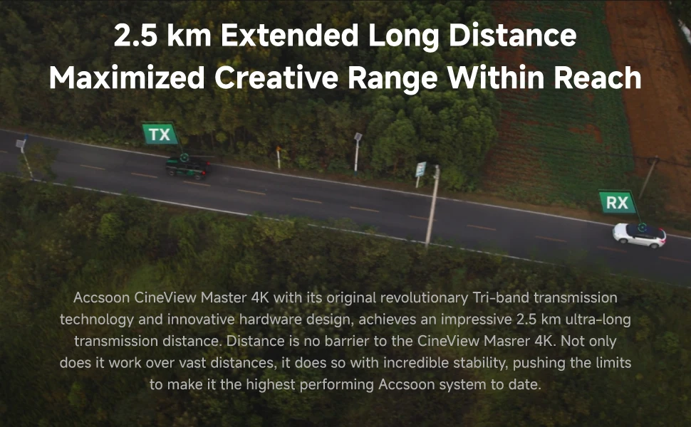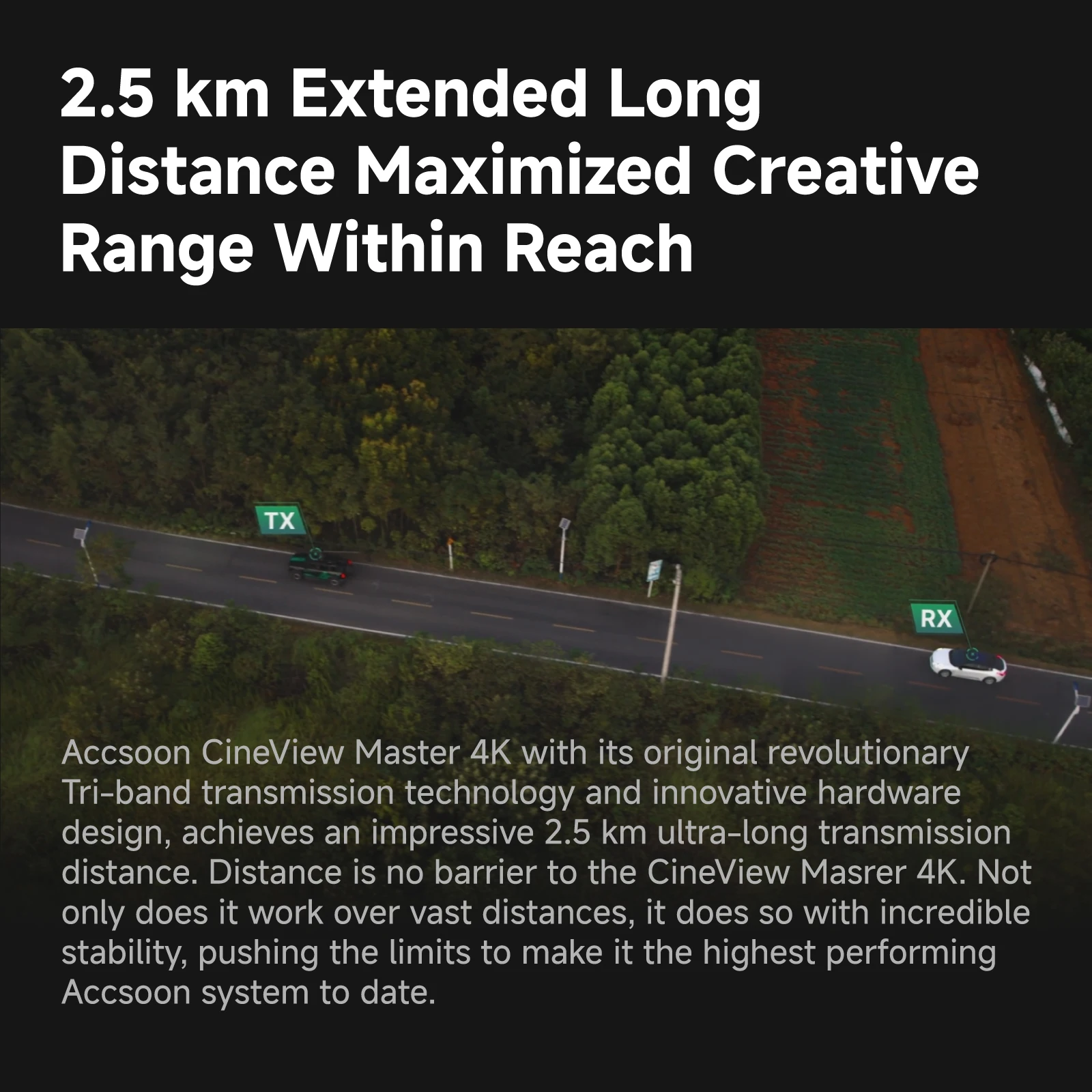 Accsoon CineView Master 4K with its original revolutionary Tri-band transmission technology and innovative hardware design,achieves an impressive 2.5 km ultra-long transmission distance.Distance is no barrier to the CineView Masrer 4K.Not only does it work over vast distances,it does so with incredible stability,pushing the limits to make it the highest performing Accsoon system to date.