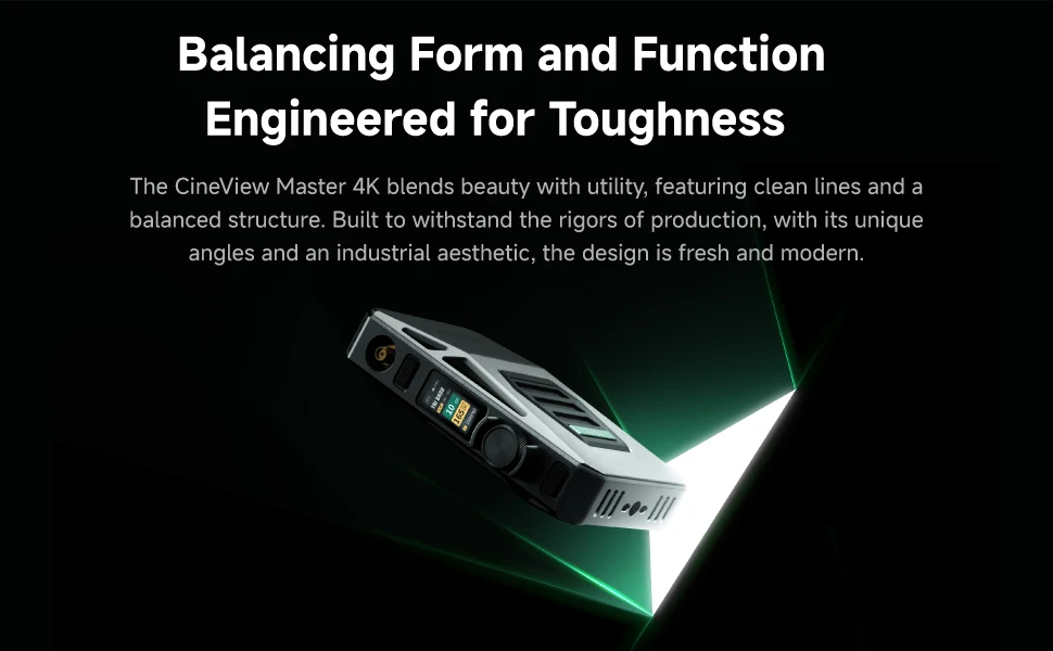 The CineView Master 4K blends beauty with utility,featuring clean lines and a balanced structure.Built to withstand the rigors of production,with its unique angles and an industrial aesthetic,the design is fresh and modern.