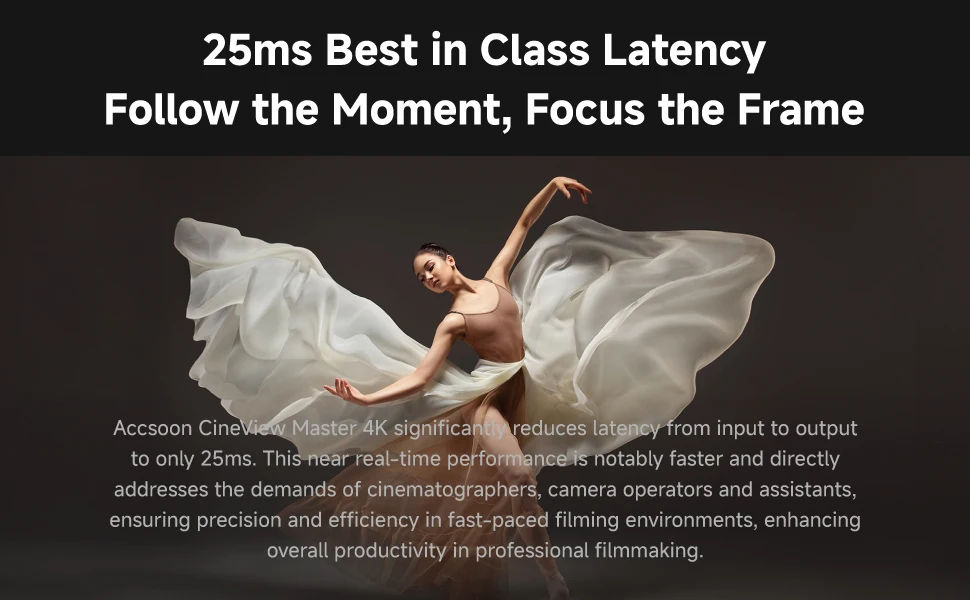 Accsoon Cineview Master 4K significant reduces latency from input to output to only 25ms.This near real-time performance is notably faster and directly addresses the demands of cinematographers,camera operators and assistants, ensuring precision and efficiency in fast-paced filming environments,enhancing overall productivity in professional filmmaking.