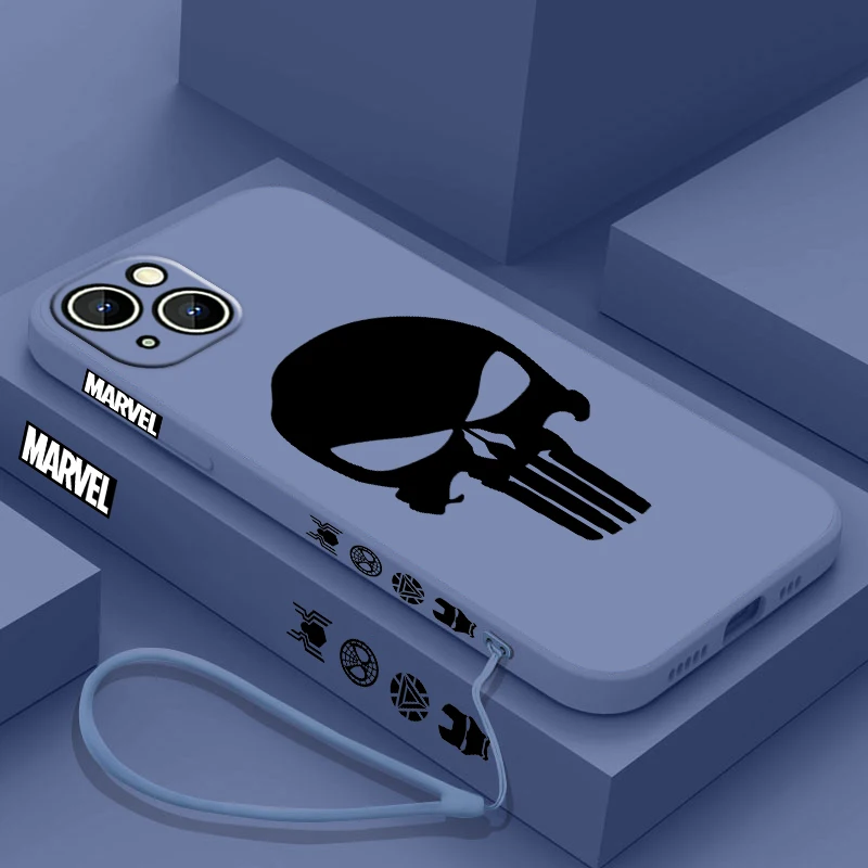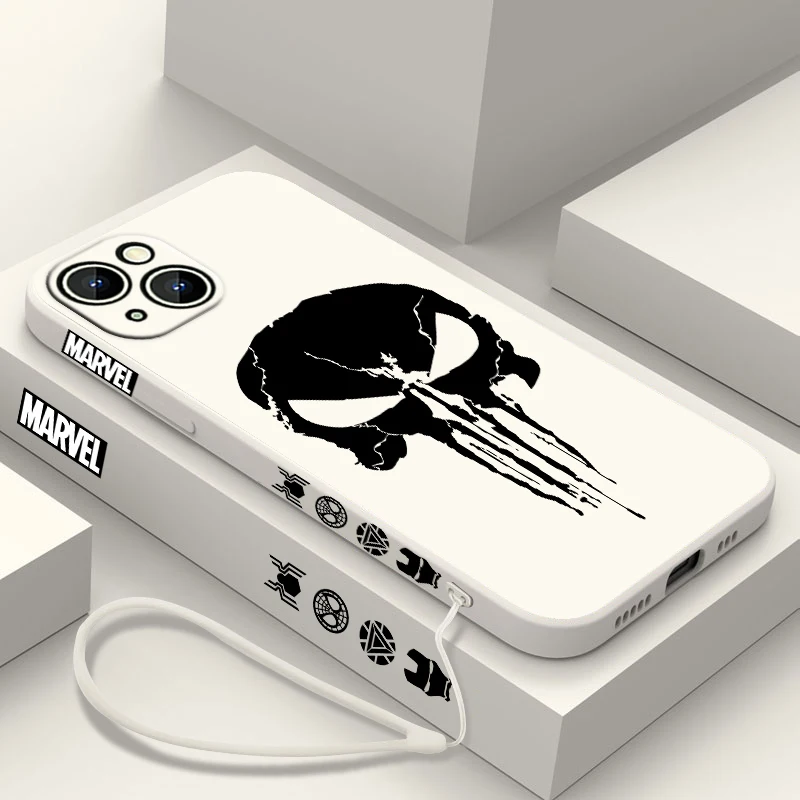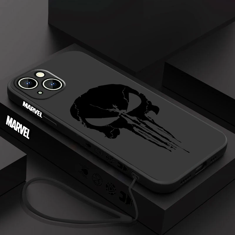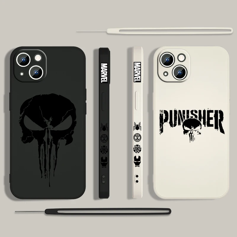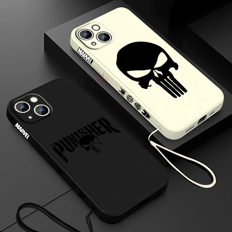 Luxury Marvel Punisher Logo Phone Case For Apple iPhone 15 14 13 12 11 Pro Max Plus 8 7 SE Liquid Left Rope Capa Cover