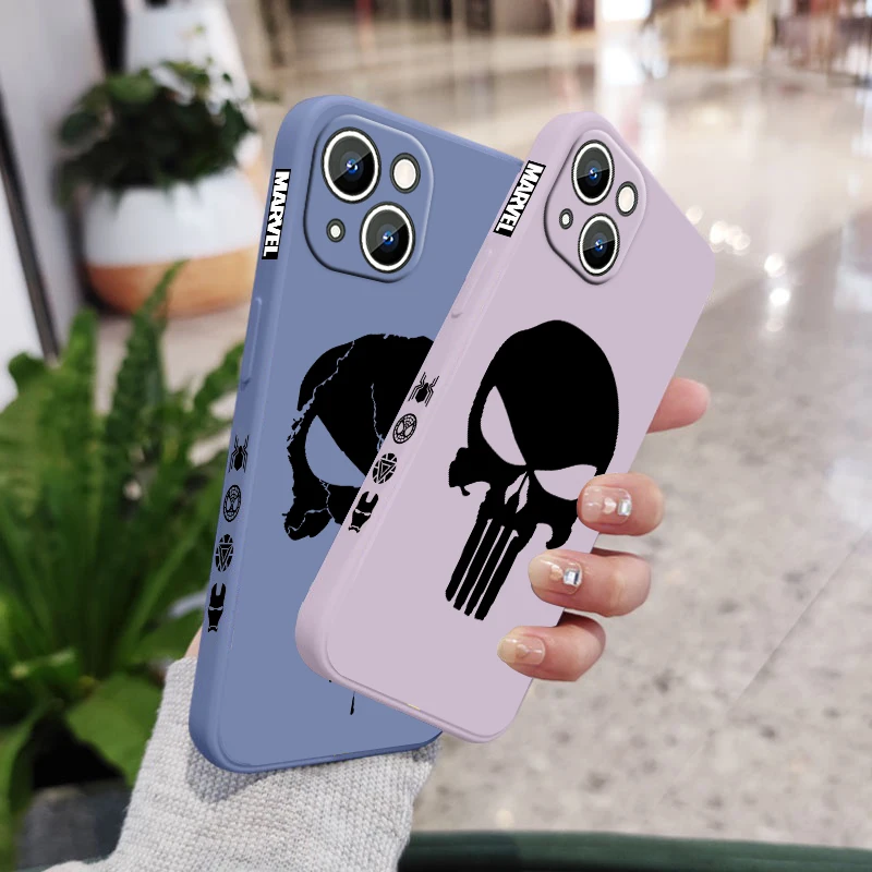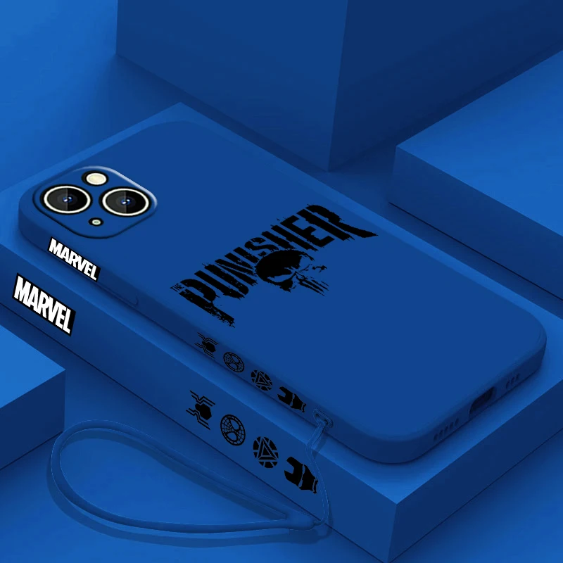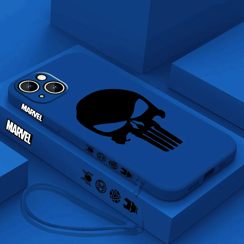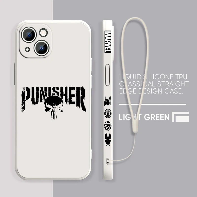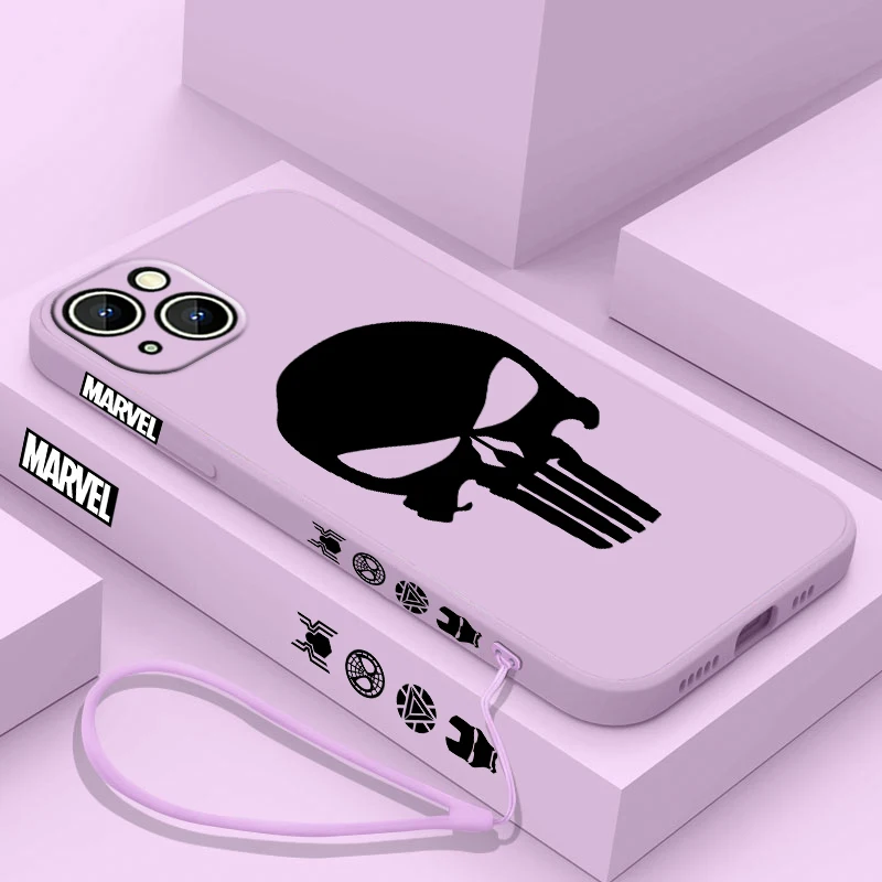 Luxury Marvel Punisher Logo Phone Case For Apple iPhone 15 14 13 12 11 Pro Max Plus 8 7 SE Liquid Left Rope Capa Cover